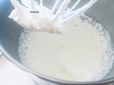 Je bats mes 130 g de crème fraiche en chantilly, j'y ajoute les 50 g de sucre pour la fixer